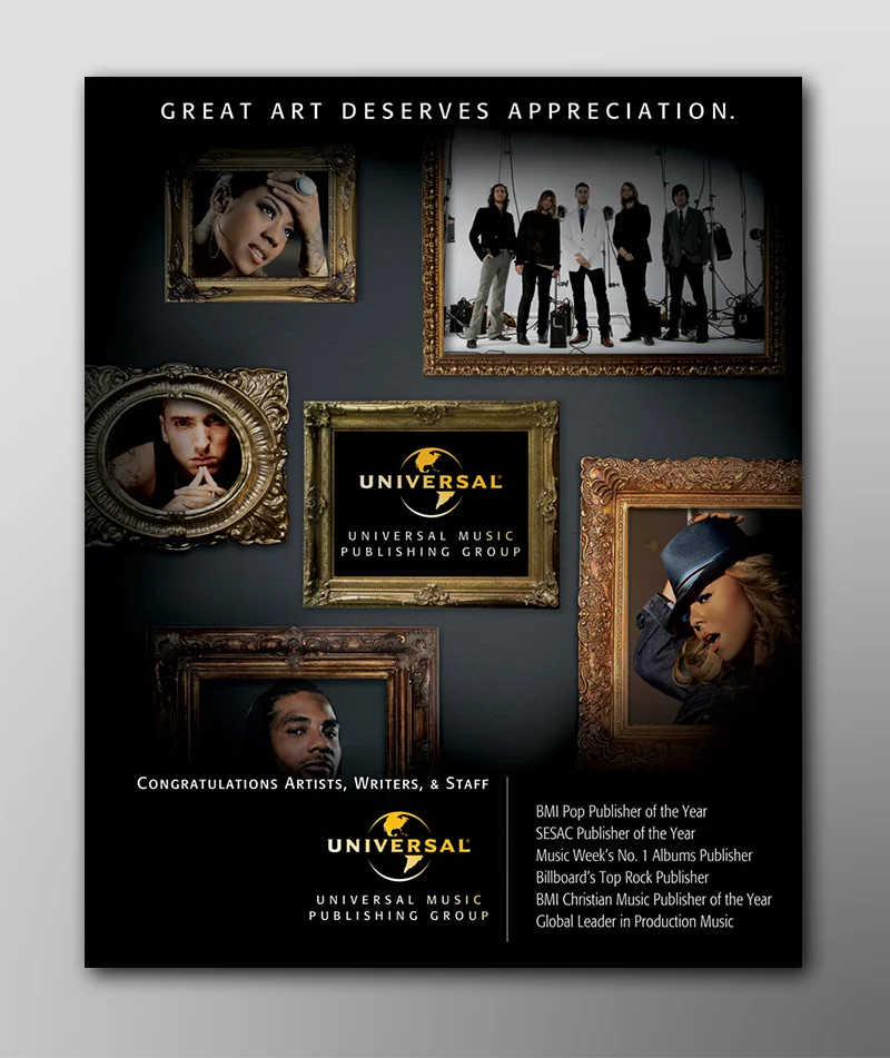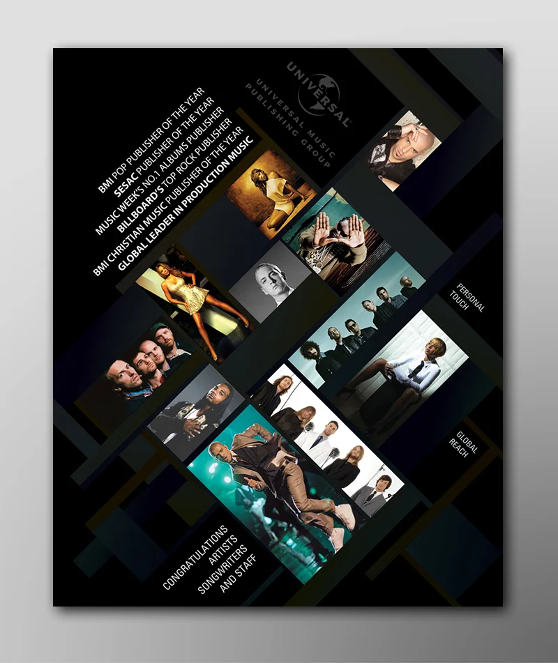 Universal Music Publishing Group® requested an assortment of print ads to run in Billboard, Variety, Hollywood Reporter, and on the cover of their own internal promotional magazine. Some ads were accompanied by Flash Banners and Email. Also requested, were branding explorations for their internal SYNCH® licensing service.