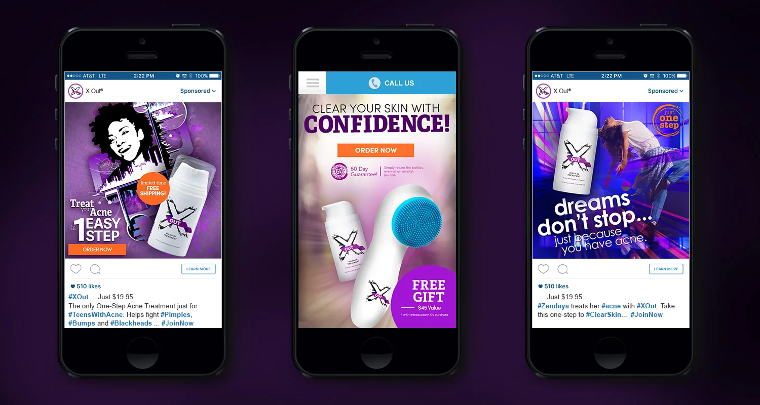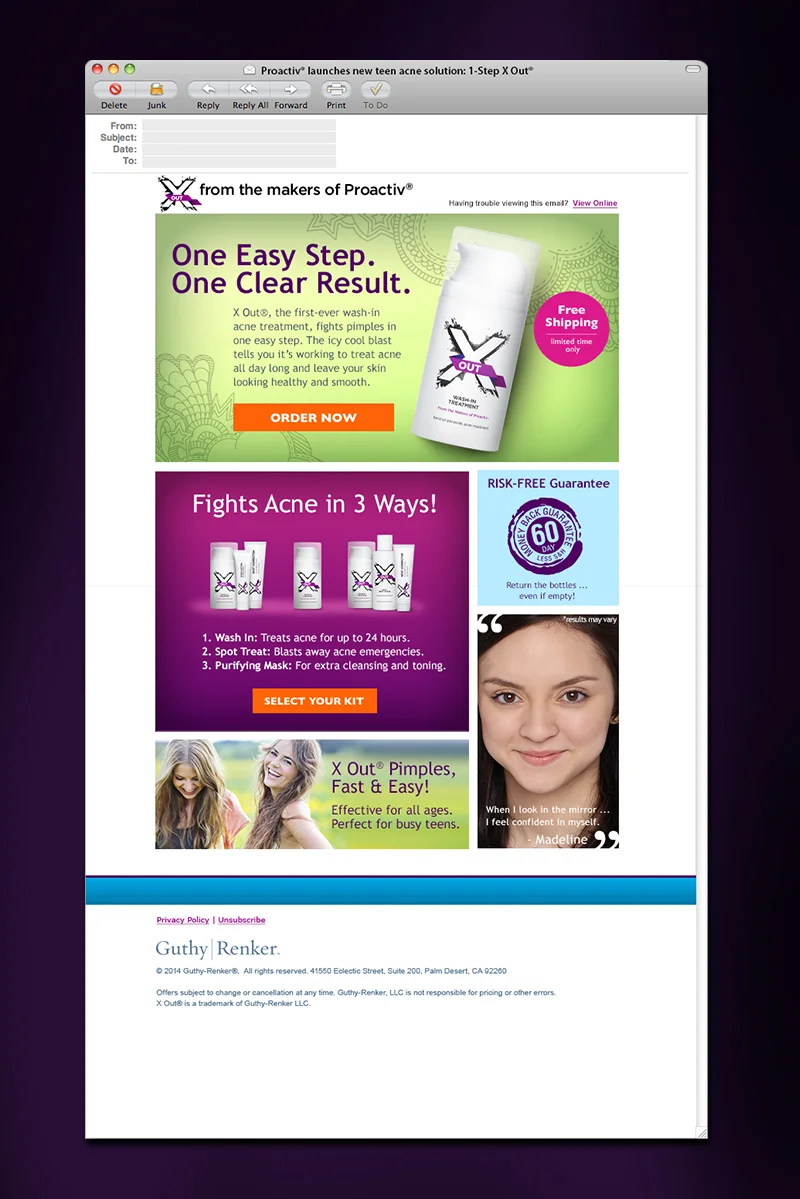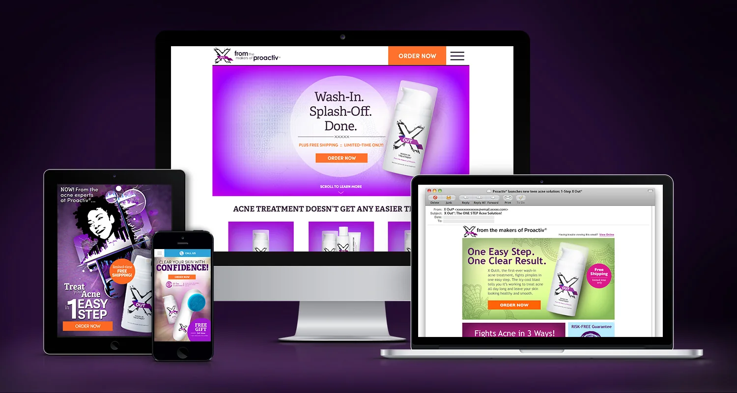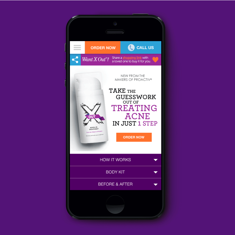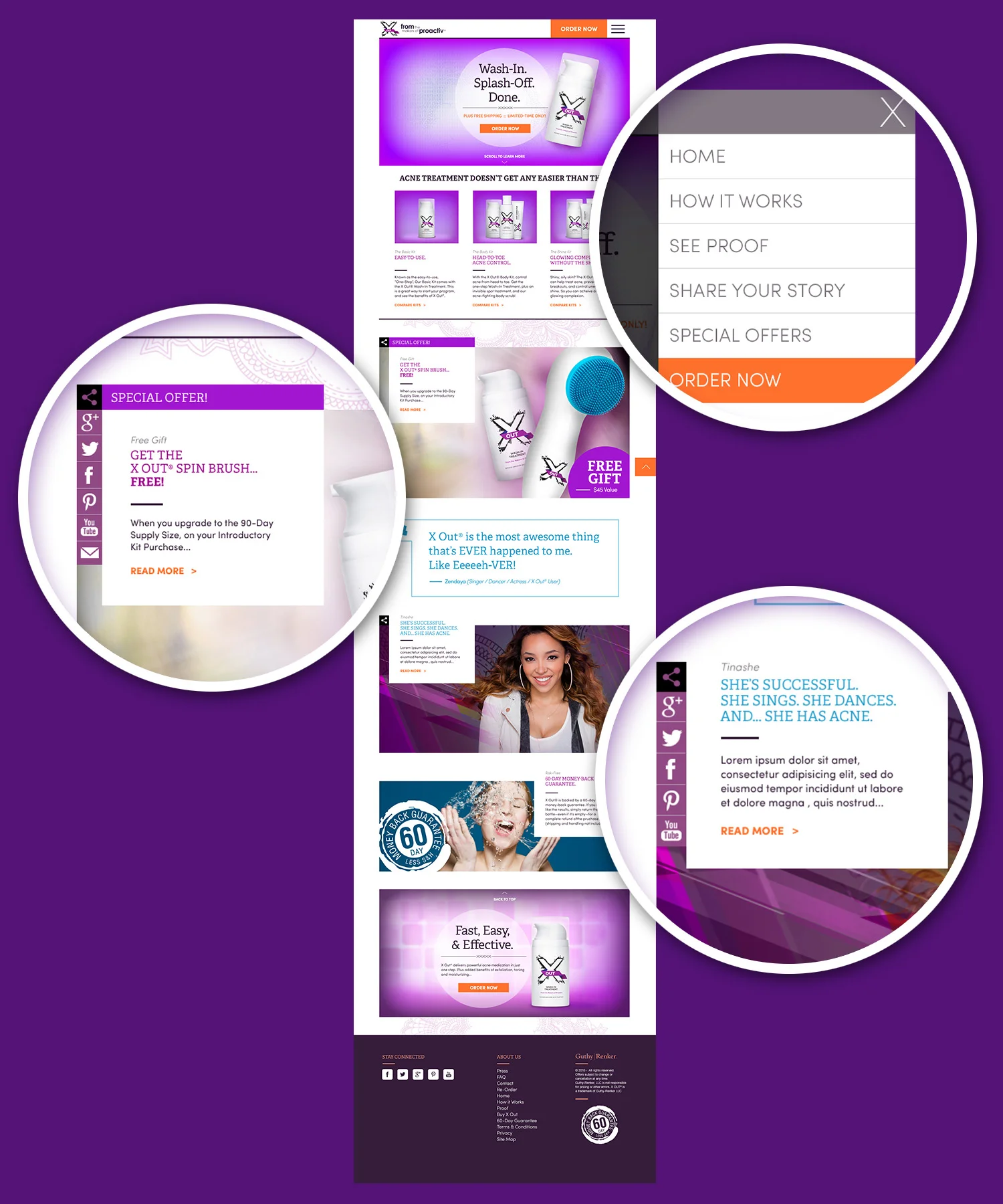UX/UI Site Redesign for X Out® — "Teen-Targeting" Acne Treatment brand. Goal was to create a new online brand presence, with celebrity-focus and Social Media sharing capabilities. Release to include email and display promotions.
